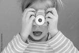 Preschool girl plays with toy camera, pink striped shirt, learning photography, early creativity, child's imagination, pretend play, fun Kid imitates photographer