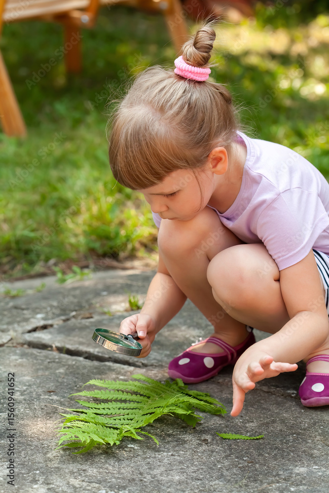 Young girl child crouching outdoors studying fern leaves using a magnifying glass exploring nature and learning about ecology and environment in summer backyard nature observation curiosity concept