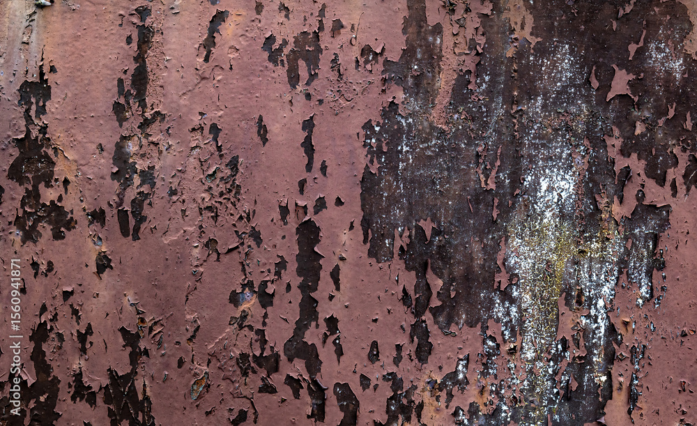 Rusty brown metal sheet with peeling cracked paint, corroded industrial surface texture, grunge abstract background of weathered aged steel gate decay, flaking layers, rough distressed wall closeup