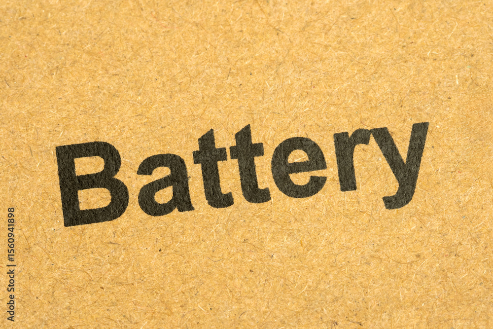 Closeup of black printed word “battery” on a brown cardboard box surface, macro detail view of recycled paper packaging for shipping lithium ion cells labeled container power storage logistics concept