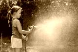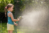 Young girl child spraying water mist with garden hose in sunny backyard on a summer day, copy space background playful childhood outdoor activities. playing with water, refreshing cooling fun concept