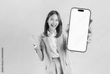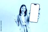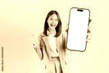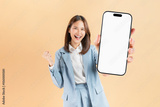 Confident Asian businesswoman holding big smartphone mockup of blank screen and smiling on beige color background.