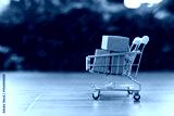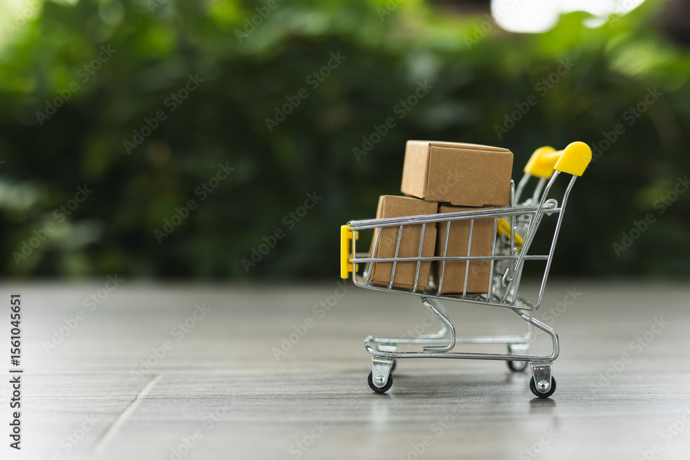 Shopping cart or trolley with Paper box, copy space. Put product in basket. delivery logistic sell service. Online shopping.