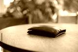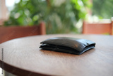 Black wallet resting on wooden table in bright cafe