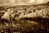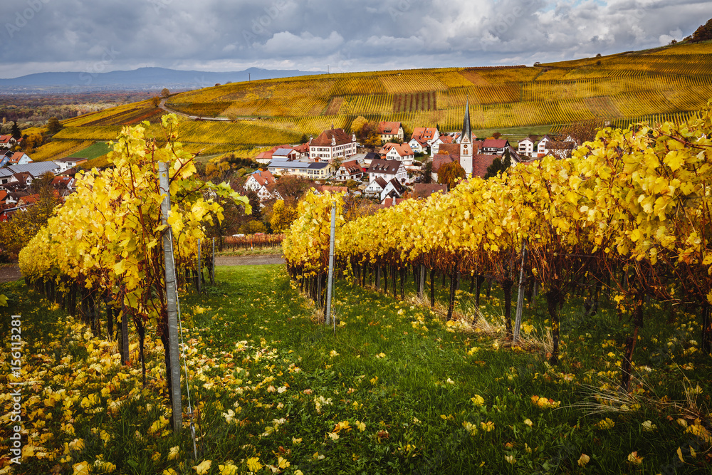 Picturesque autumn countryside landscape with colorful vineyards and historic village. Black Forest, Germany. Scenic wine-making and hiking background. Popular travel destination.