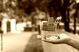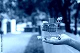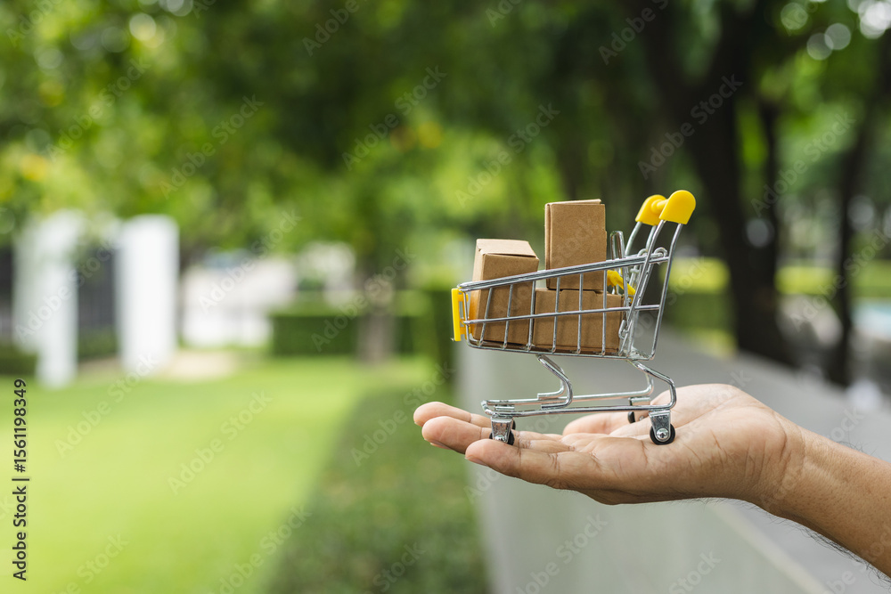 Shopping cart with small paper box on a hand green background. Trolley basket in supermarket.