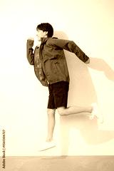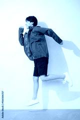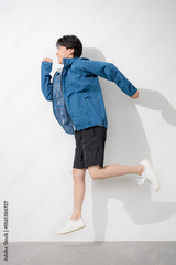 スポーツウェアで走るジャンプするポーズの男性の全身 運動楽しい~