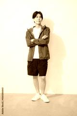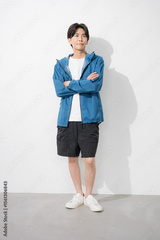スポーツウェアで腕組みをする若い男性 見上げる全身
