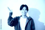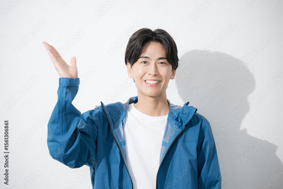 スポーツウェアで指差しするオススメポーズの若い男性 カメラ目線