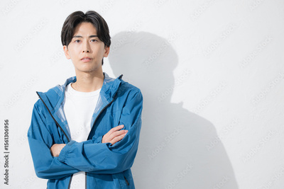 Young man in sportswear, arms folded, looking at camera with serious expression