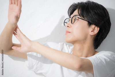 日焼け止めを塗る眼鏡の男性 腕に日焼け止めなどを塗る 夏の暑さ対策