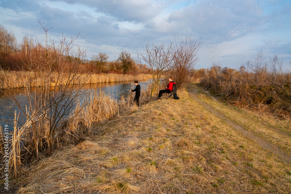 Two men fishing by a river bank at sunset in autumn landscape. Dry grass, bare trees, cloudy sky. Leisure outdoor hobby.