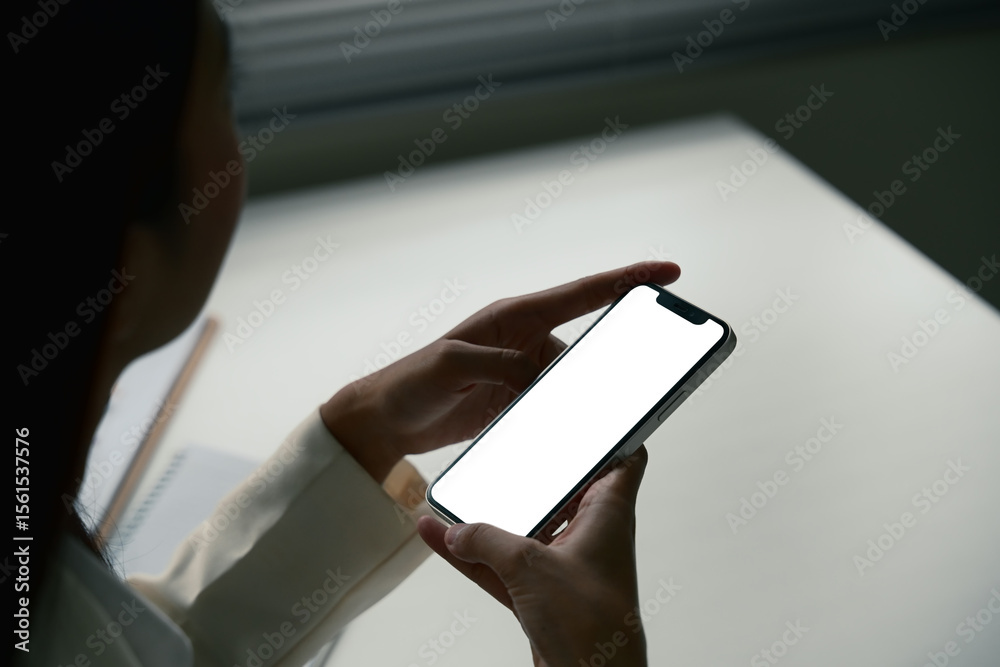 Close up of woman holding mobile phone with blank display ready for app mockup