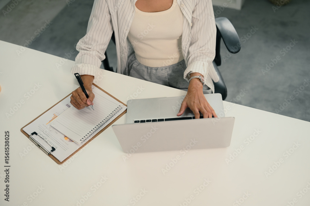 Top view of female entrepreneur using laptop and taking notes on clipboard