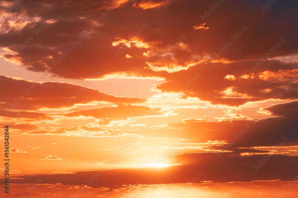 Amazing Bold Golden Sunset Sunrise Sky Background. Natural Bright Orange Dramatic Sky In Sunset Dawn Sunrise. Warm Yellow And Orange Colors