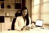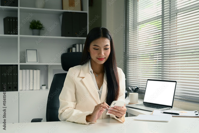 Elegant businesswoman in beige suit using mobile phone at clean white desk