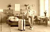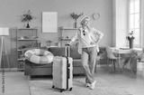 Smiling woman in casual clothes and hat standing with yellow suitcase in living room. Cheerful traveler posing at home while getting ready for vacation or trip. Summer holiday and travel concept.