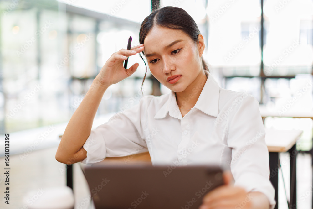 Young stressed caucasian businessasian woman working in the office. Businessman thinking too much work concept in the office.Tired, stressed headaches a long time Office syndrome concept.