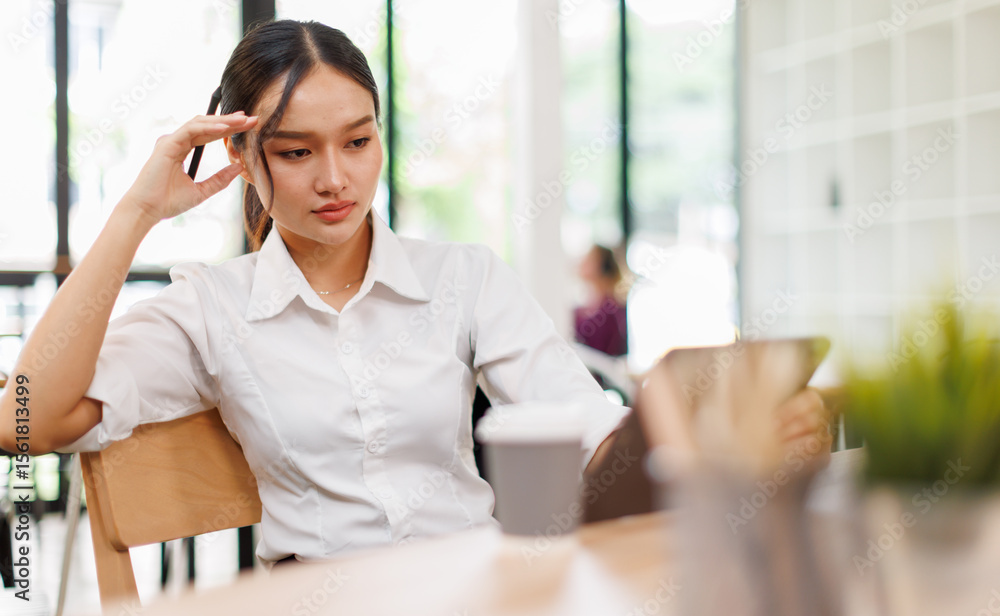 Young stressed caucasian businessasian woman working in the office. Businessman thinking too much work concept in the office.Tired, stressed headaches a long time Office syndrome concept.