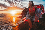 Happy woman running on beach while celebrating independence day and enjoying freedom in USA