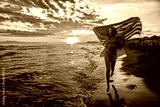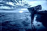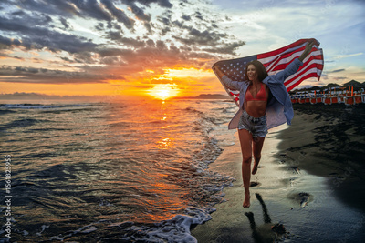 Happy woman holding american USA flag and running on the beach. Independence Day, travel concept