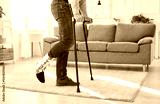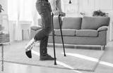 Cropped photo of disabled young man with broken leg after accident using crutches standing in living room at home. Handicapped guy with plastered leg. Rehabilitation and recovery concept.