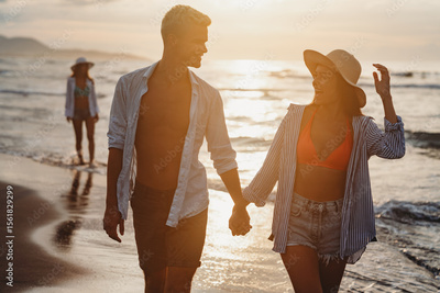 Young beautiful couple walks along the seashore at sunset. Honeymoon. Romantic trip.
