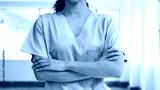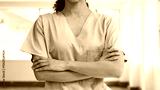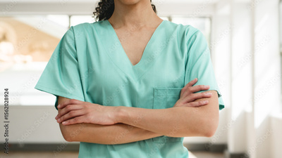 Confident Medical Professional in Scrubs with Arms Crossed Standing in Modern Healthcare Environment