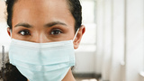Close-Up of Woman Wearing a Protective Medical Mask Indoors During Daytime