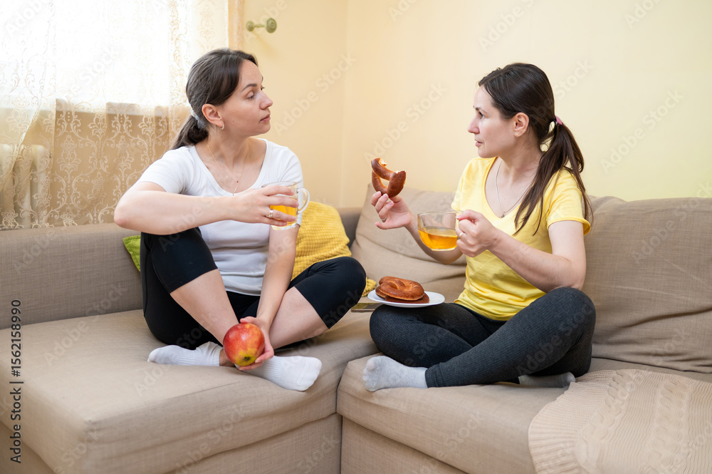 Two women sitting on sofa, talking, laughing, enjoying snacks and drinks, leisure and friendship concept