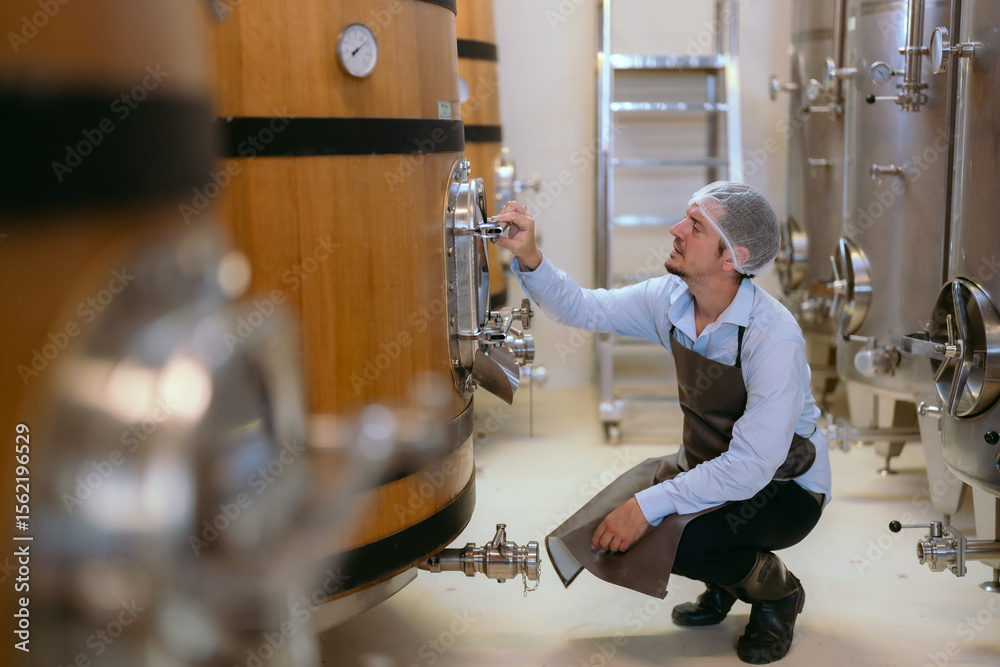 Winery worker inspecting fermentation tanks in a modern facility during daytime