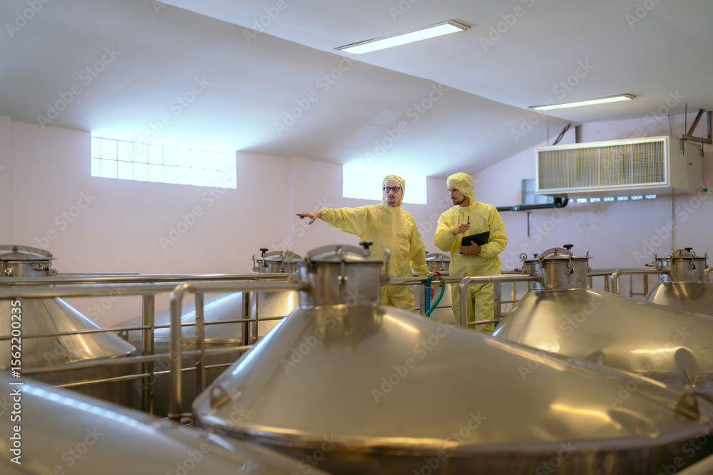 Technicians inspect fermentation tanks in a modern brewing facility during a quality control process