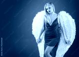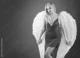 Lady in red. Angel girl in Red Sexy Dress and white wings. Beauty blonde Woman Isolated Red Background. Sexy Woman in Dress. Fashion Model with Red Lips. Elegant Woman. Valentines day.