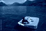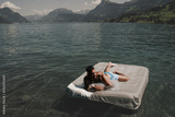 Fit athlete resting on the infinity mattress in water. Handsome traveler enjoying a seaside. Muscular guy rest in clear sea or ocean water. Sexy male model sunbathing on a private beach. Hot summer.