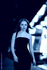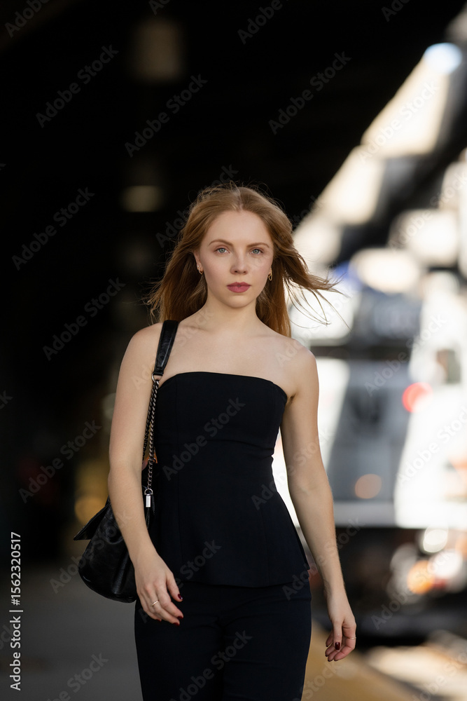 Woman waiting for a train at the station. Young traveler. Model on vacation trip. Girl by train wagon. Portrait of a pretty traveler. Woman at railway station. Summer holiday vibes. Travel and style.