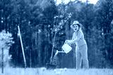 Kid with shovel in garden. Child cultivating a tree in garden. Child planting tree. Spring garden with kids. Child watering tree in garden.