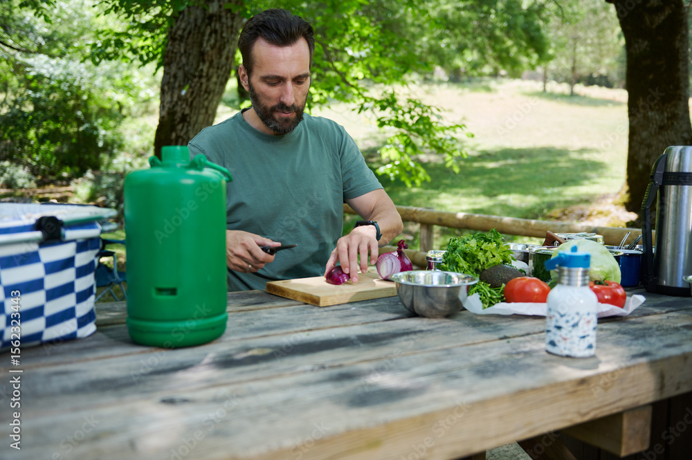 Man Preparing Vegetables Outdoors During a Scenic Picnic in Nature