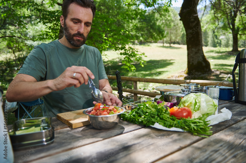 Man Preparing Fresh Salad Outdoors with Garden Vegetables and Ingredients on a Wooden Table in Nature