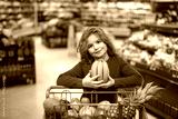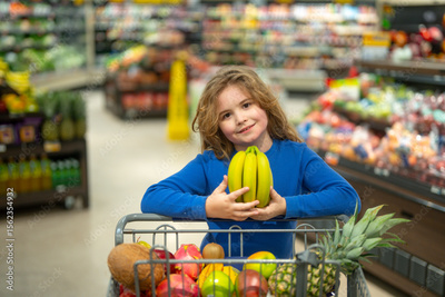 Child shopping in grocery store. Kid in supermarket. Child with shopping cart in grocery. Kid shopping healthy food in grocery market. Grocery store with kid. Organic food in groceries.