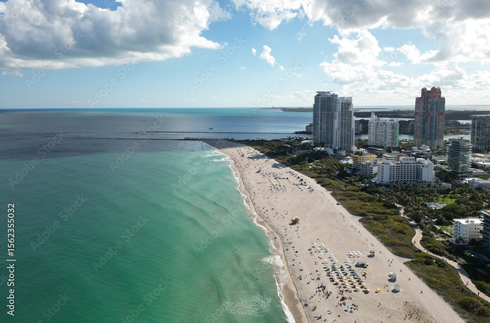 Miami beach cityscape. Miami summer aerial view. Miami Beach shoreline. South Beach Miami aerial view. Blue ocean in Florida skyline. Miamis cityscape. Ocean coast. Summer vacation in America.