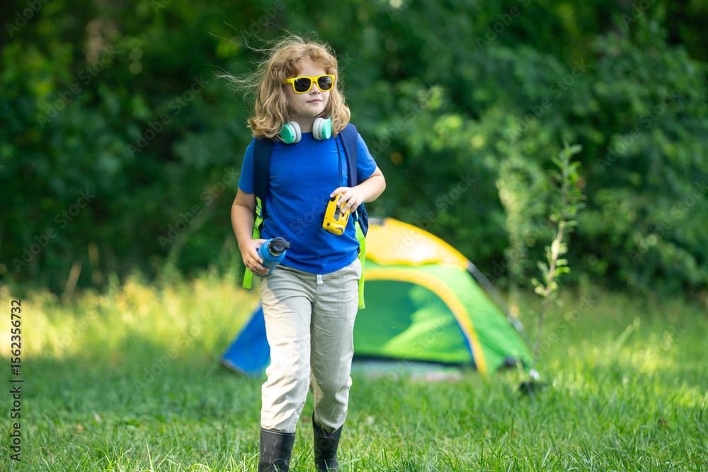 Child on picnic or nature trip in summer. Kid Fun on camping. Little tourist on nature. Child enjoying summer camp. Kid exploring nature outdoors. Happy child on a camping trip. Picnic with kids.