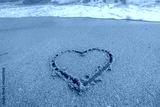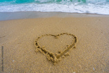 Heart drawn in sand. Waves forming a heart shape sign. Love on beach. Romantic summer. Heart made of sand. Love and ocean waves.