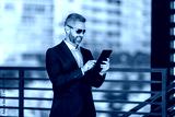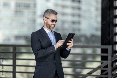 Finance expert reviewing a contract. Businessman outdoors with tablet. Businessman using tablet outside. Mature businessman checking finance data. Rich businessman reviewing contract on tablet.