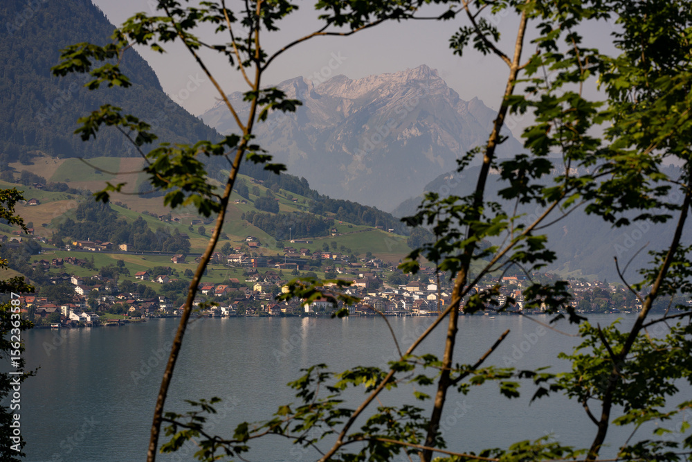 Alps mountains and like in Switzerland. Alps nature in Switzerland. Swiss Alps. Panoramic of the nature of Switzerland. Nature of Swiss lakes. Switzerland scenic landscape. Alps Nature background.