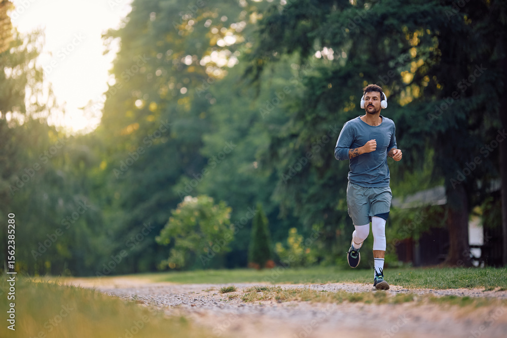Male runner jogging through park.