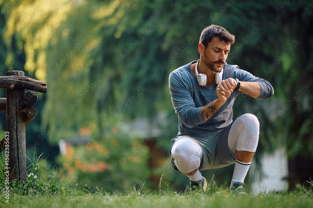 Athletic man measuring his heart rate on smartwatch during sports training outdoors.