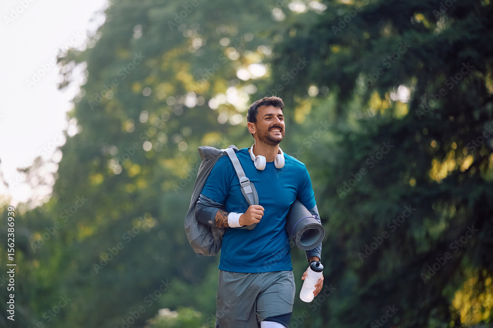 Happy sportsman with exercise equipment and water bottle walking through park.
