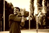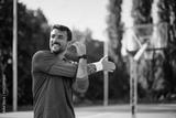 Happy athletic man doing stretching exercises during sports training outdoors.