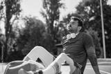 Male athlete resting after working out on sport court outdoors.