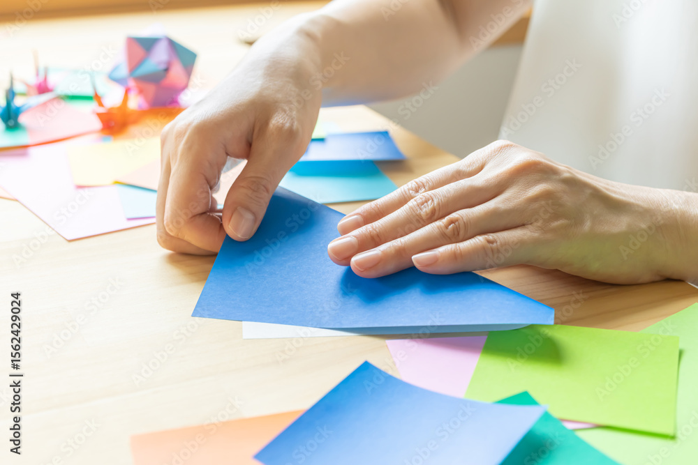折り紙 折紙を折る女性の手